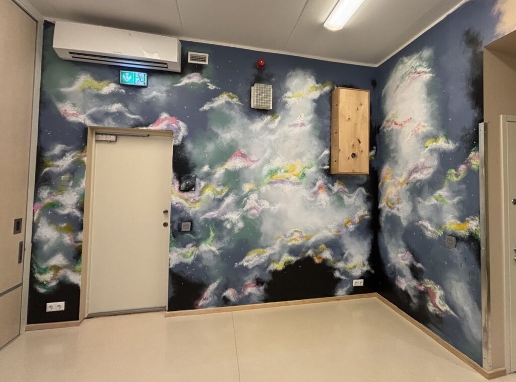 Esimene suur projekt tuli tellimusena asutuse poolt- ühele väikerühma ruumile oli vaja värsket ilmet. Nii sündis idee maalida seinale galaktika. Teema sobis, kuna see on neutraalne ja universaalne, ei tõrju kedagi ja mida saab alati vajadusel veidi kohendada, kui elu seinamaali proovile paneb.