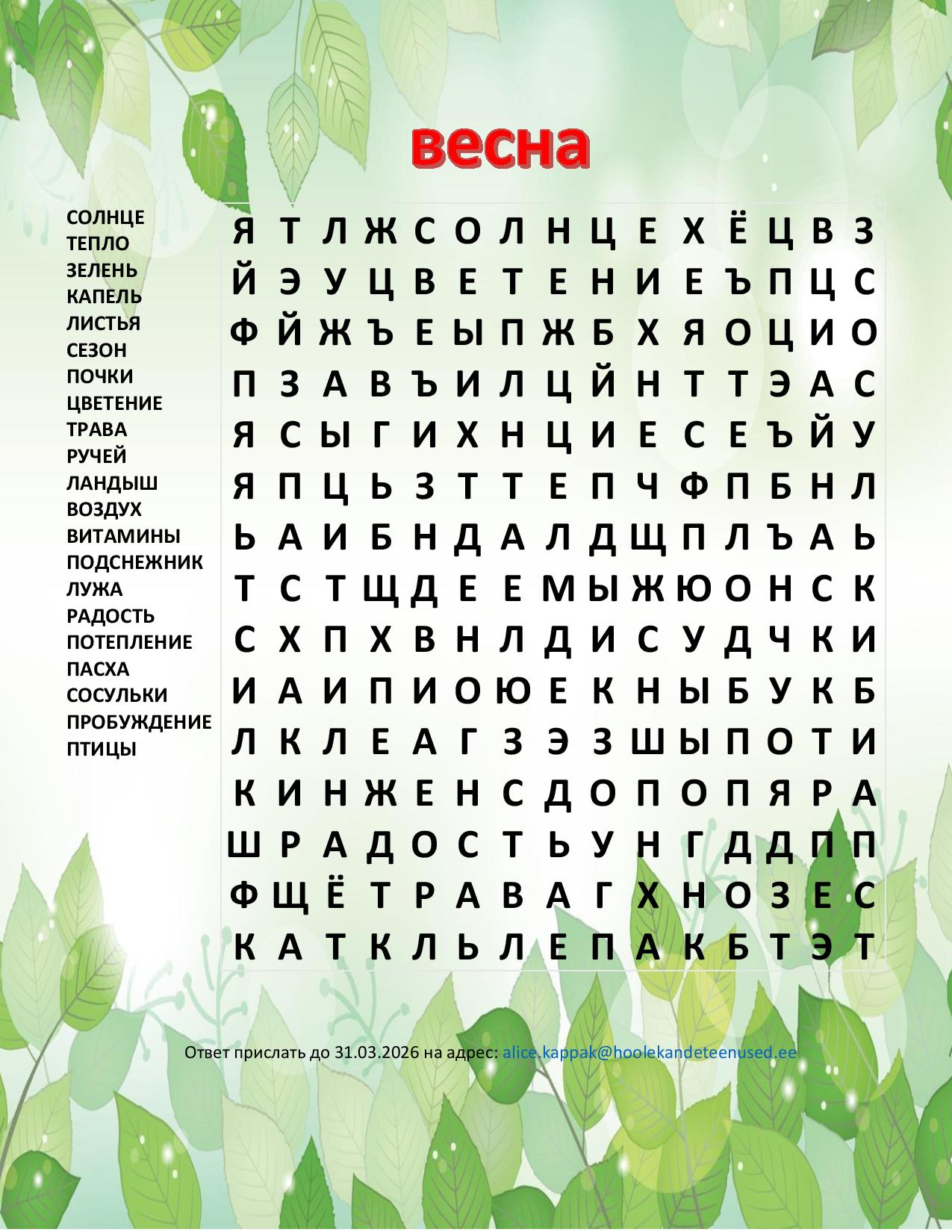 Sillamäe Gagarini kodu elanikud koostasid venekeelse sõnasegadiku kevadest. Leia sealt kõik sõnad, üks jääb üle – see ongi vastus, mille saad saata kuni 31.03.2026 aadressil , et võita kodu poolt auhind. Palju õnne veebruari võitjale Margaritale Haapsalu Tamme kodust!