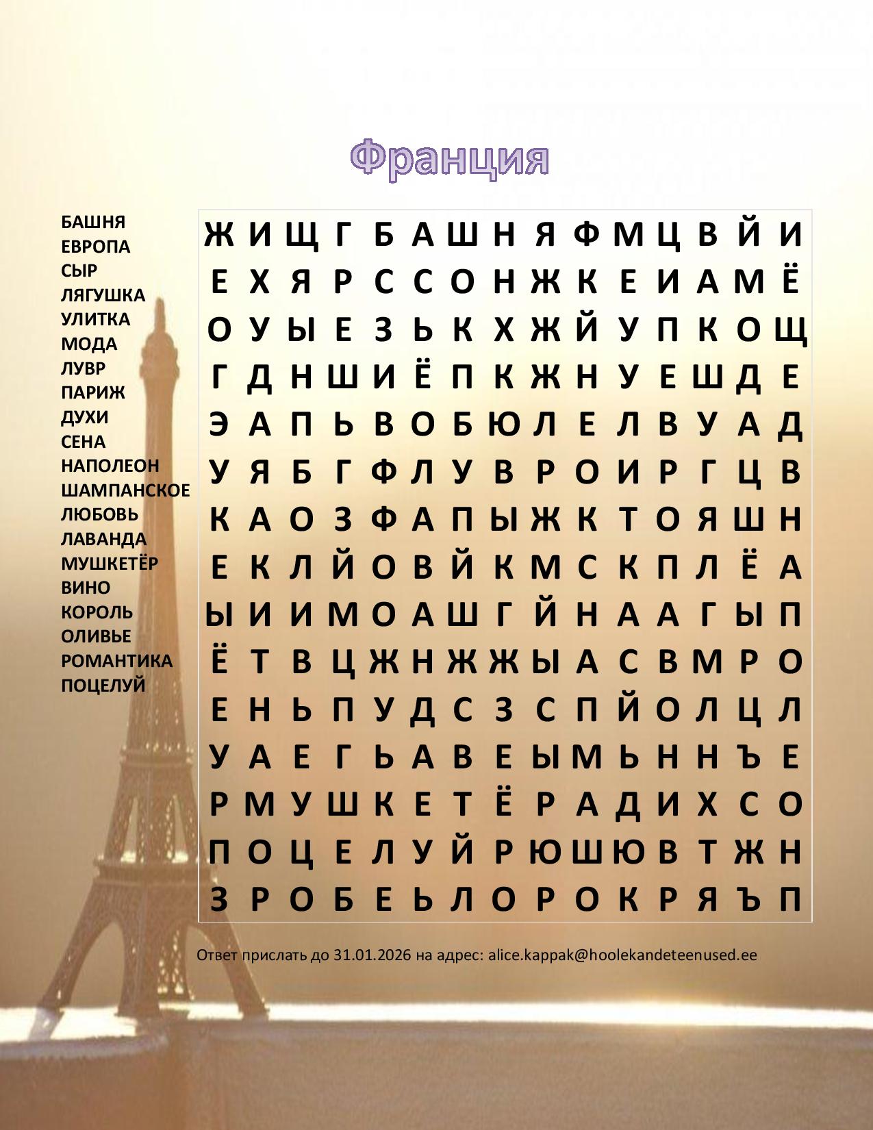 Sillamäe Gagarini kodu elanikud koostasid venekeelse sõnasegadiku Prantsusmaast. Leia sealt kõik sõnad, üks jääb üle – see ongi vastus, mille saad saata kuni 31.01.2026 aadressil , et võita kodu poolt auhind. Palju õnne detsembri võitjale Aivorile Kehra Kodust!