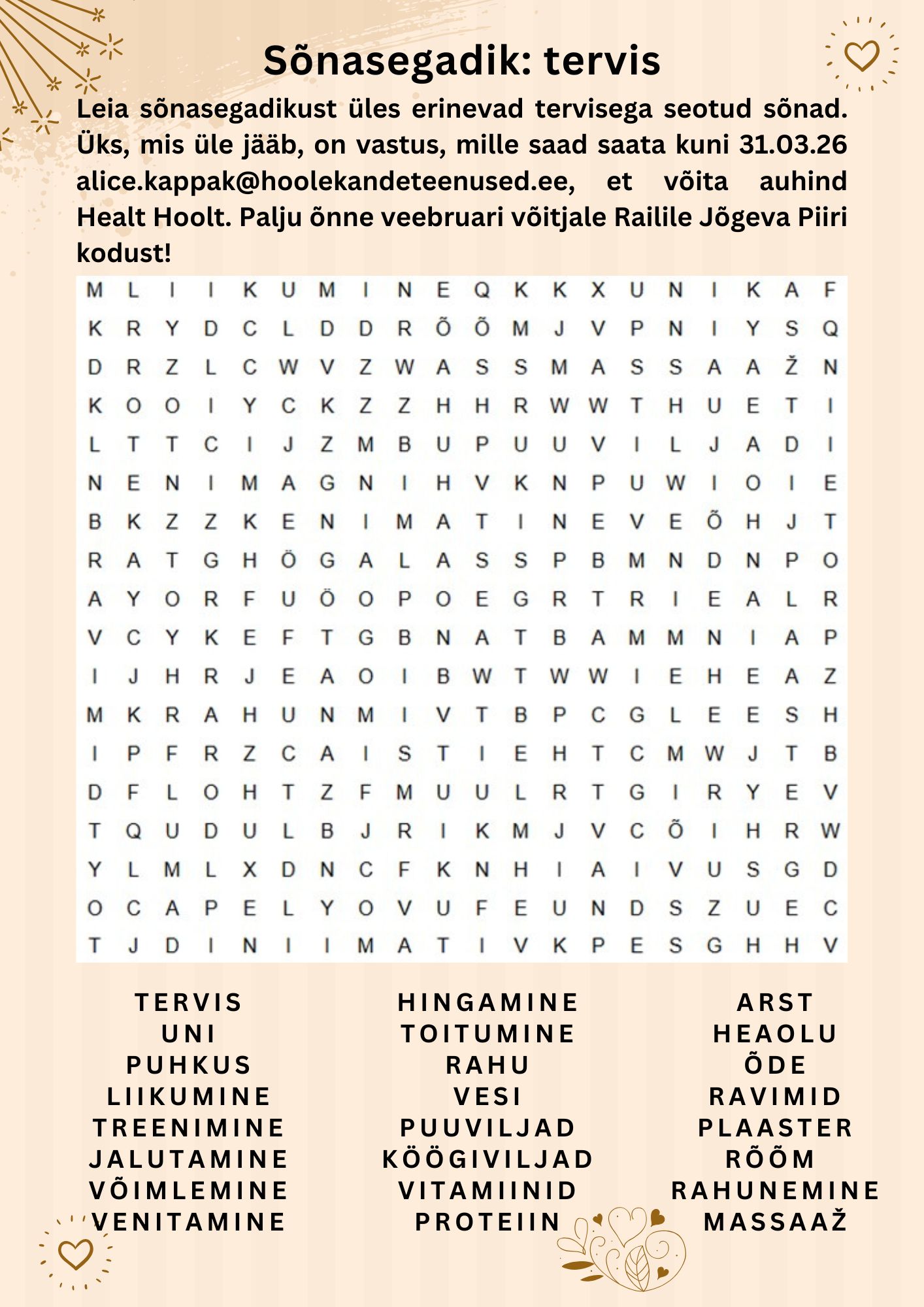 Leia sõnasegadikust üles erinevad tervisega seotud sõnad. Üks, mis üle jääb, on vastus, mille saad saata kuni 31.03.26  , et võita auhind Healt Hoolt. Palju õnne veebruari võitjale Railile Jõgeva Piiri kodust!