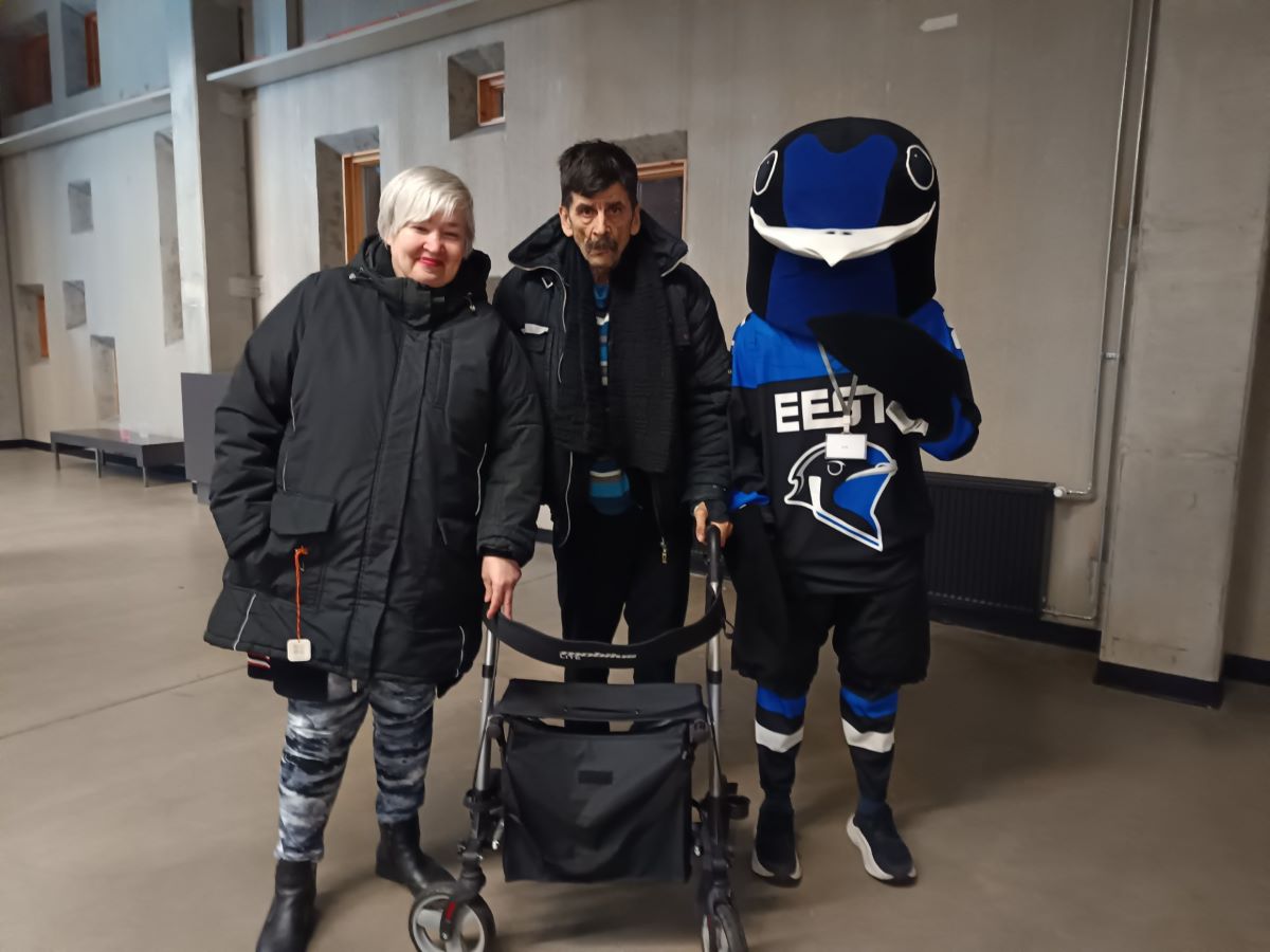 Jõudsime kuskil 17:30 kohale Tondiraba Jäähalli juurde ja tegevusjuhendaja Mark lasi meid sissepääsu juures bussist välja, parkis bussi ära ja siis saime kõik koos sisse minna. Näitasime pileteid ja olimegi sees. Esimese asjana nägime, et sai osta hokipluuse, mütse, suuri pluuse, sinimustvalgeid kilejopesid ja ka igasuguseid suupisteid. Meie juurde tuli üks suur pääsuke (kes on maskott). Tahtsime koos Peetriga pääsukesega pilti teha ja Mark tegigi. Seejärel sisenesime sinna, kus istumiskohad olid. Pidime istuma teise ritta, aga jäime hoopis ülemisse ritta. Tegime toolid lahti ja istusime. Ja kellelgi polnud ruumipuudust.