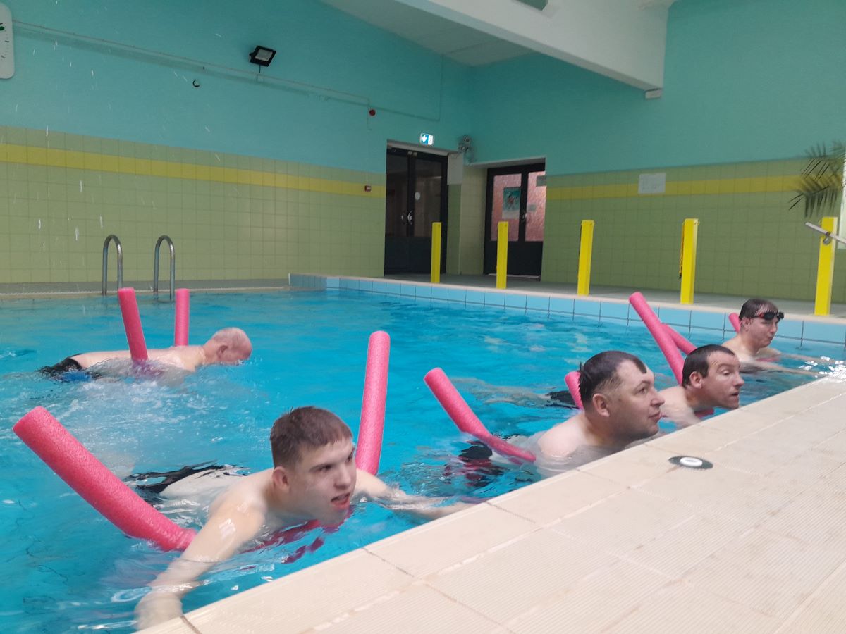 Treeningu lõpus kasutasime ujumise abivahendeid, mille panime ümber keha. „Nuudlite” abil tegime esimesi ujumisharjutusi ja õppisime vee peal püsima.