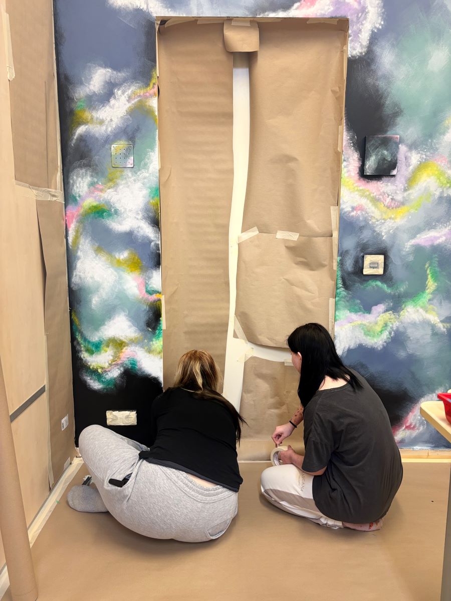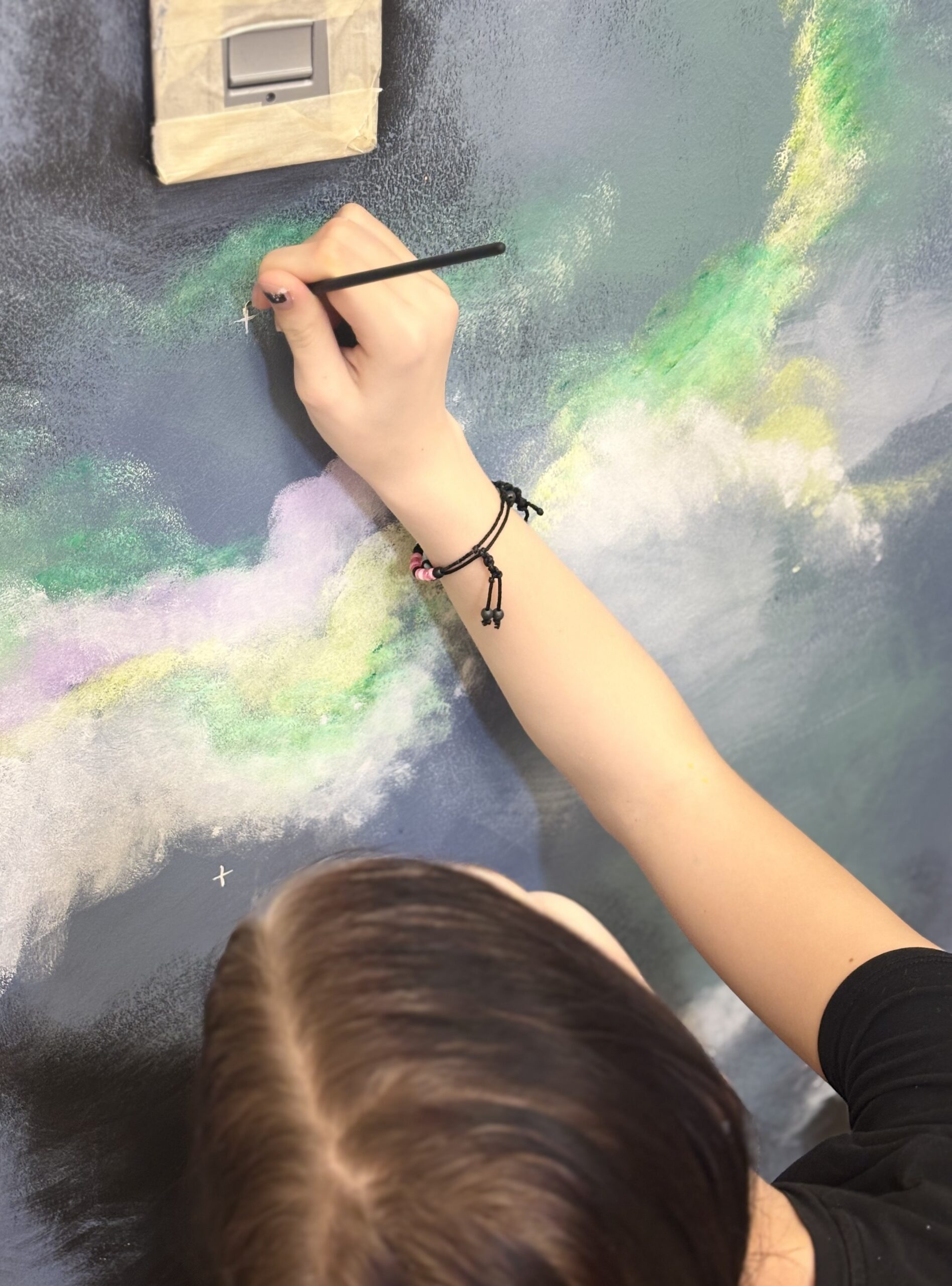 Maal ise pakkus lastele tehnilisi väljakutseid: värvide hajutamine, kihtide ehitamine, valguslahenduste loomine ja pihustustehnikaga töötamine. Kõik need oskused arenesid samm-sammult, katsetuste ja väikeste “ebaõnnestumiste” kaudu, mis tegelikult olid õppimise loomulik osa. Seinale ilmusid värvide üleminekud, tähed ja udukogud, mis iga järgmise tunni lõpuks muutusid üha terviklikumaks.