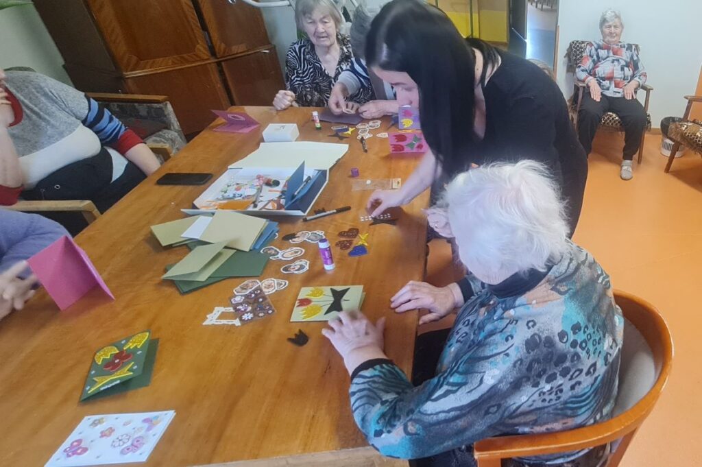 Tegevusjuhendaja Raili tutvustas kõikidele plaani toreda päeva veetmiseks. Alguses oli naabritel väike hirm, et nad ei tule kaartide meisterdamisega toime, kuid see möödus kiirelt peale esimeste kaartide valmimist. Kõik kokkutulnud said teha endale meelepärase, just oma soovidega kaardi. Tekkis suisa tõsine arutelu, kelle kaart on kõige uhkem, kuigi kõik kaardid olid omanäolised ja üks uhkem kui teine.